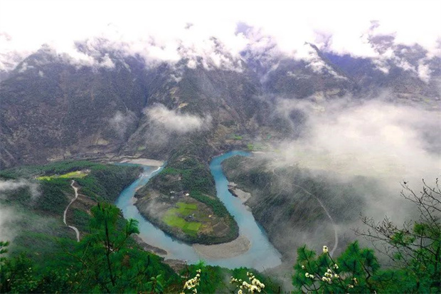 丙中洛鎮(zhèn)日丹村附近的U型大拐彎,是怒江大峽谷中最具代表性的景觀之一,怒江因為遇到王箐大懸?guī)r絕壁和丹拉大山
