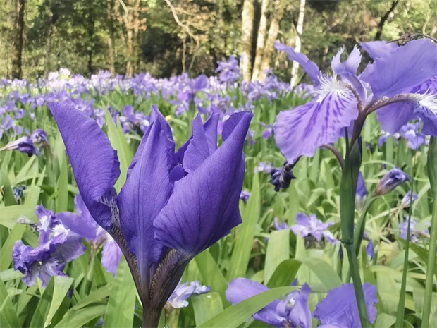 親密接觸。遠處,那些錯落有致的鳶尾花與周圍的山林相互映襯,讓靜寂的山林多了幾分嫵媚與溫馨。